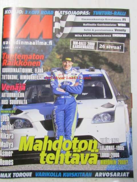 Vauhdin Maailma 2008 nr. 1 -mm. puheenaihe. makasiini. galleria. kolumni jume. teema. koeajo. mestareiden taustapiru. F1 on vaihtoehto kriketille. naama mieleen. uudet tuulet. kolumni Clarkson. MM-rallikuski 2008. itestä kiinni. Runkireissu a'la Toni. kolumni Jouhki.TUHTI WRC-ennakkopaketti. Tunturi-rallin katsojaopas. näilkäinen haastaja. maailmanmestari ja mesenaatti. kolumni Vainio. oman tiensä kulkija. erämaan kettu. rapakon takana. SM/Lady Cup Riihimäki. lyhyet. tuloksia.21 x 29 cm.