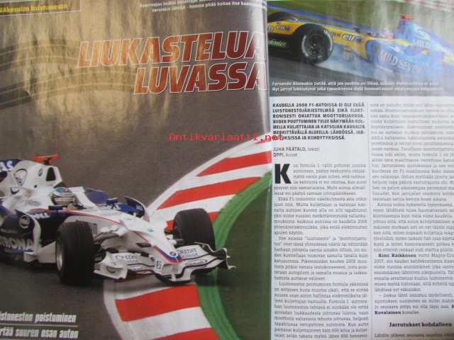 Vauhdin Maailma 2008 nr. F1 maailma -mm. Puheenaihe Kimi Räikkönen ja lewis Hamilton. Makasiini Tallit, Kuskit, Osakilpailut. Galleria Tähtihetket. Kolumni JuMe Suomalaisuuden korkeaveisu. Teema Näkemiin luistonesto. Oman tiensä kulkija Kimi Räikkönen. Made in Maranello. Aihetta hymyyn Heikki Kovalainen. Piilaakso. Montrealin ihme Robert Kubica. Kolumni Clarkson. Tallit ja kuljettajat Ferrari, BMW Sauber, Renault, Williams, Red Bull, Toyota, Toto Rosso, Honda, Super Aguri, Force India ja McLaren. Osakilpailut ja radat Australia, Malesia, Bahrain, Espanja, Turkki, Monaco, Kanada, Ranska, Iso-Britannia, Saksa, Unkari, Eurooppa, Belgia, Italia, Singapore, Japani, Kiina, Brasilia. Tilastoja 1950-2007. Varikoilla kuiskitaan. TOP 10. Lyhyt oppimäärä.22 x 29 cm.