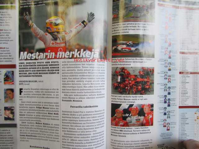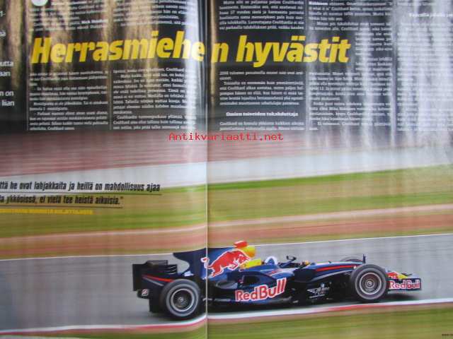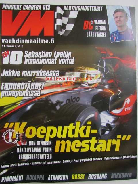 Vauhdin Maailma 2008 nr. 12 -mm. Teema Jarmo Mikkonen, Pekka Siikala. Makasiini. Galleria. Nautinto kaikilla aisteilla Juuso Pykälistö. Kaikkivaltias Mika Häkkinen, Lewis Hamilton. Herrasmiehen hyvästit David Coulthard. Kohtuullisen lupaava kausi VM analyysi. F1-makasiini kuntopuntari. Kolumni Clarkson F1 uudistuu. Ei mitään tiukkapipo. Ennätysten murskaaja. Kolumni Hirvonen. Kannakosken toinen nopea. Erilainen kotimatka. Kolumni Vainio. Ajajan ura USA:ssa - tulta vai tuhkaa?. Amerikan formulat. Nuorta verta kaivataan. Sinunkaupat Ducatin kanssa. Matkalla kuninkuusluokkaan. Täystyöllistetty ammattilainen. F1 Kiinan, Brasilia GP. WRC Japani.22 x 29 cm.