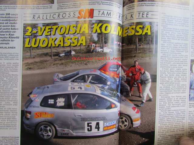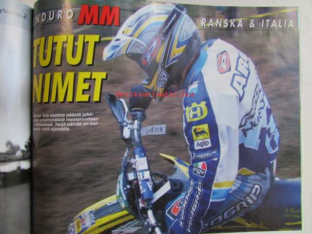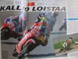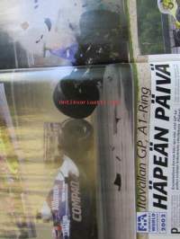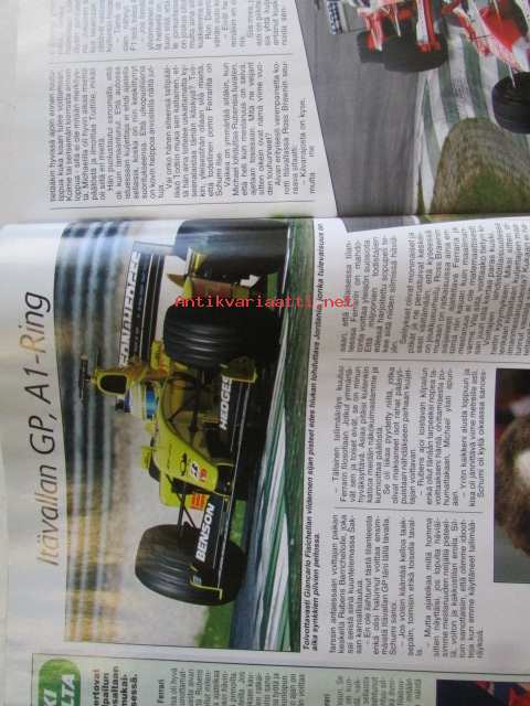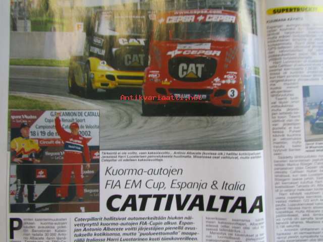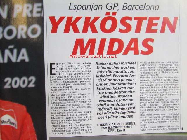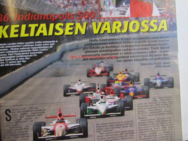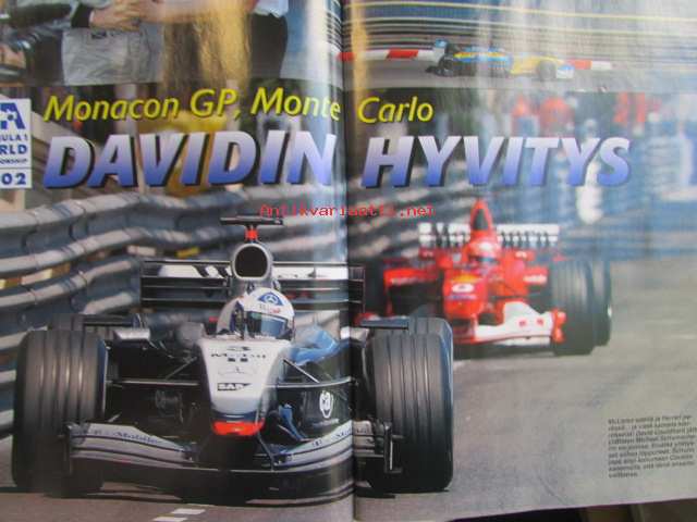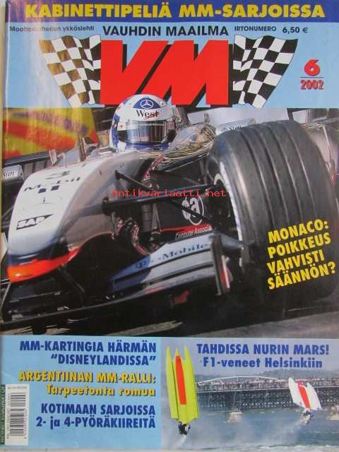 Vauhdin Maailma 2002 nr 6 -mm. Formula 1 Espanja, Itävalta & Monaco, Indy 500, Rata-SM Ahvenisto & Motopark, Kuorma-autojen EM Espanja & Italia, Ralli-MM Argentiina, rallicross-SM Tampere & Kitee, Drag SM ja -PM Motopark, Sprint-SM Joensuu & Nurmijärvi, FK-MM Alahärmä, RR-MM Espanja & Ranska, Enduro-MM Ranksa & Italia, Motocross-EM Heinola, Ducati Cup 2002, VM Maistelee Peugeot 206 SW 20.0 GTI, Formula 1 Helsinki. 22 x 29 cm.