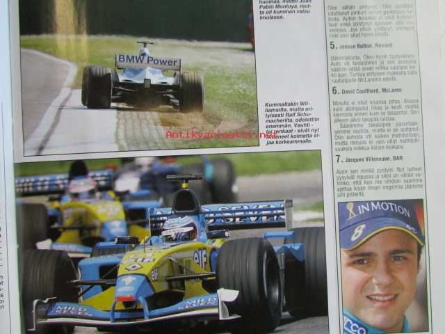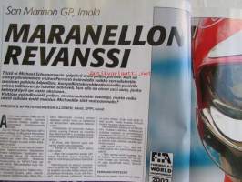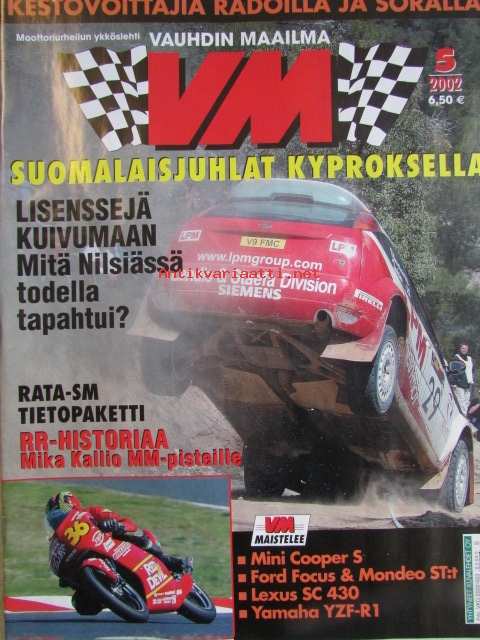 Vauhdin Maailma 2002 nr 5 -mm. RR-MM Japani & Etelä-Afrikka, Motocross-SM -ennakko, Enduro-MM Portugali & Kreikka, VM Maistelee, Yamaha YZF-F1, Motocross-MM Espanja, Puheenaiheena venttiili, Eltsu Sprint Helsinki, Ralli- MM Kypros, Formula 1 Brasilia & San Marino, Rata-SM -ennakko, Formula 3 sarjat Britannia & Saksa, 25th American Car Show Helsinki, VM Maistelee, Ford Focus ST 170, Ford Mondeo ST 220, Mini Cooper S, Lexus SC 430, Elämäni kisa Seppo Nieminen.22 x 29 cm.