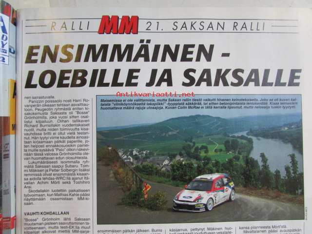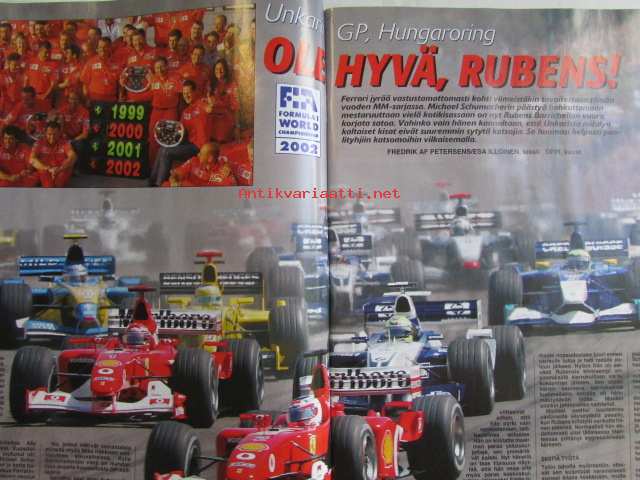 Lehtimiehet Oy, 2002Vauhdin Maailma 2002 nr 10 -mm. WRC-autojen tulevaisuus, Ralli-SM Uusikaupunki, Ralli-MM Saksa, F-Cup Laihia, Historic Rally Trophy Naantali, Formula 1 Unkari & Belgia, CART & IRL, Rata-SM Ahvenisto, RC-EM Hollanti Belgia & Norja, Rallicross-SM Joensuu, Historic Grand Race Gulf Cup, JM-SM Liigafinaali, Drag EM PM & SM, SM-Sprint Kouvola, VM Maistelee, Wiesmann Roadster, RR-MM Tsekki Biaggin yllätys, RR-SM Räyskälä, Six Days Enduro, Elämäni kisa Antero "Linkku" Lindqvist.22 x 29 cm.