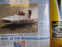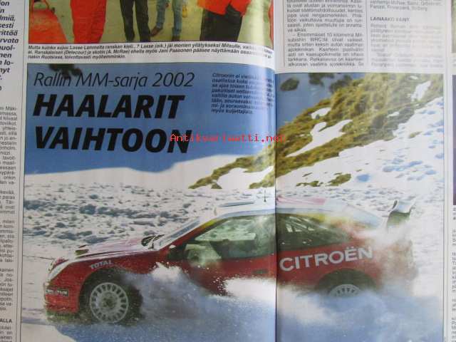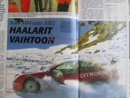 Vauhdin Maailma 2002 nr 1 -mm. Arctic Lapland Rally Rovaniemi, Ruotsi MM-ralli, Rallivuosi 2002, Ove Andersson, Toyota Formula 1, Formula 1 2002, USA:n ratakausi 2001, Eurooppalaiset ratasarjat 2001, Mestareiden kisa Kanaria, Bettegan muotokisa Italia, VM Maistelee Peugeot 206 WRC, Essen Motorshow, VM Maistelee Honda Civic Type-R, Toyota Corolla VVTL -i T Sport, VM Käyttötesti Skoda Octavia RS, K-G Paukapää maistelee Mini Cooper, MP 2002 -näyttelyopas, Moottoripyörät Suomessa, Juha Salminen, AKK 50 vuotta, AKK-palkintogaala, SML-Palkintogaala, Kilpailukausi 2001, Elämäni kisa Eino Elo.21 x 29 cm.