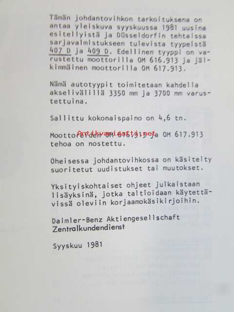 Mercedes-Benz Jakeluautot 407 D ja 409 D - Huoltotöiden johdantovihko, Katso tarkemmat mallit ja sisällysluettelo kuvista