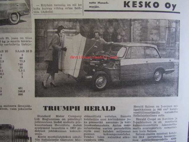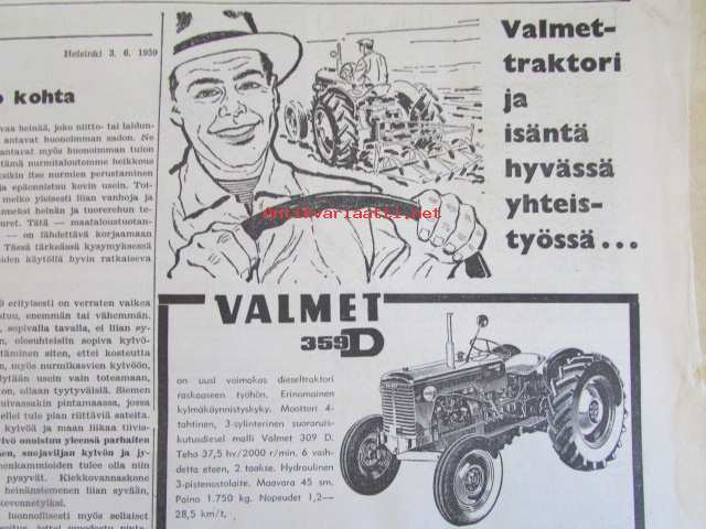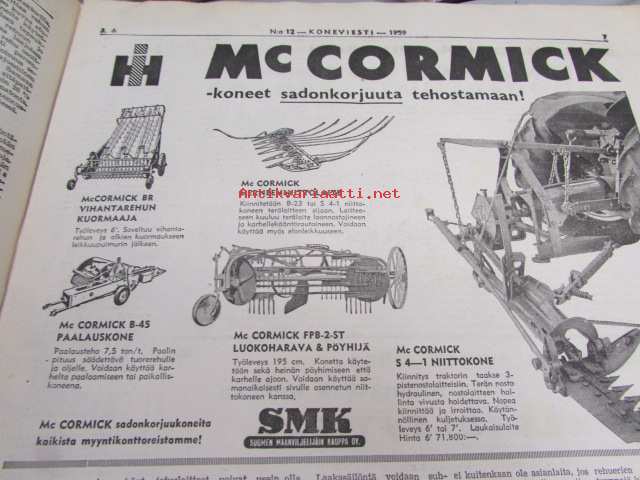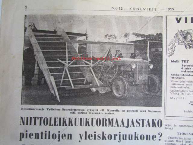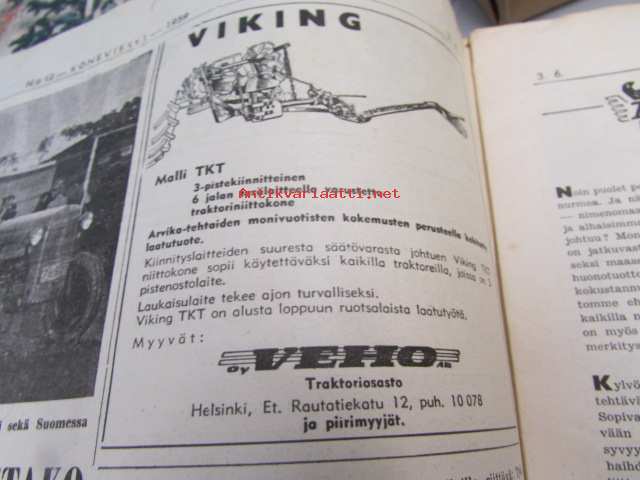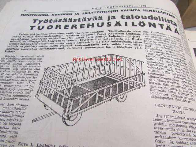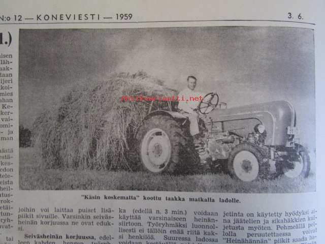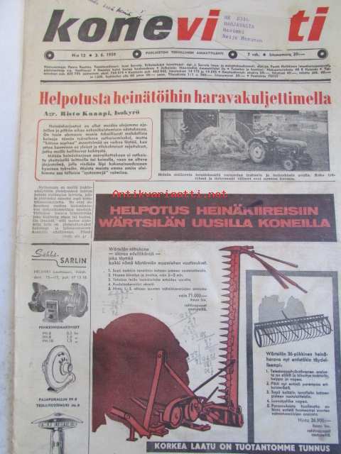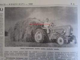 Maaseudun Ammattilehti Oy, 1959Koneviesti 1959 nr 12, 13.6.1959 sis. mm. seur. artikkelit / kuvat; Haravakuljetin, tuorerehusäilöntää, Fiskars aurat, Kesän 1959 heinänkorjuukoneita, Volvo PV 544 Sport koeajao, Titan 5000 saha