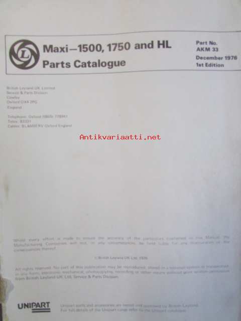 British Leyland Maxi 1500, 1750 an HL Parts Catalogue 1976 1st edition AKM 33 - varaosaluettelo