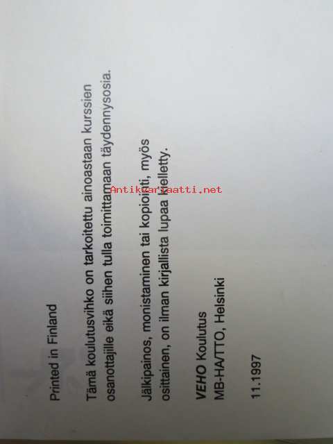 | Saatavilla | 1 kpl | | Julkaisuvuosi | 1997 | | Sivuja | 69 | | Kunto | K2 | | Sidonta/painoasu | Nidottu (pehmeäk.) | | Kielet | Suomi |