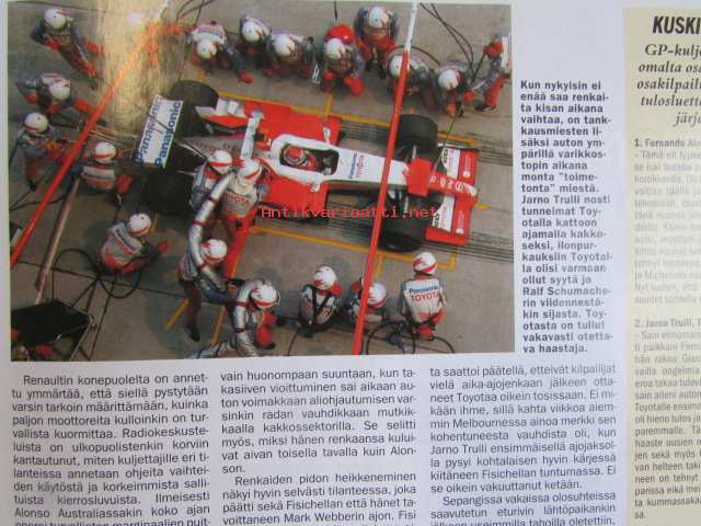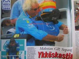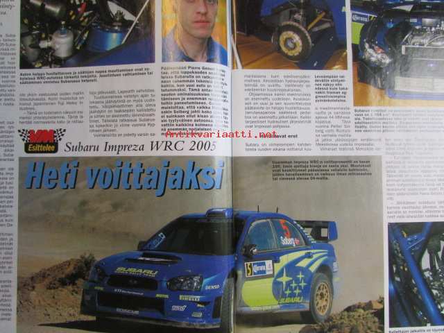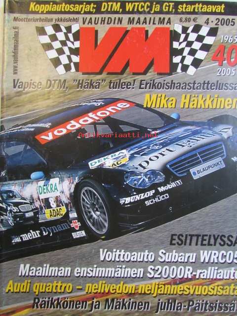 Vauhdin Maailma 2005 nr. 4 -mm. Ralli-MM Meksiko, Rallirenkaat, Ralli-SM Laukaa, Ralli-SM Nuoret & Lady Cup Mäntsälä, Historic Rally Trophy Oulu, Rallisprint-SM Ähtäri, Formula 1 Australia & Malesia, Mika Häkkinen, WTCC ja GT-sarjat, IRL ja CCWS, Formulanuoret, Jäärata-SM Kiuruvesi, Toyota Corolla S2000R, Subaru Imperza WRC05, Audi quattro, VM Käyttötesti Mazda3 GT GTC, Geneve autönäyttely, American Car Show Helsinki, Päijänne-Ajo, Jäärata-SM Orivesi, Konnevesi & Varkaus, Motocrossin kauslennakko, Elämäni kisa Riitta Grön.21 x 29 cm.