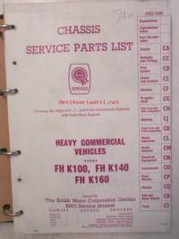 BMC Heavy Commercial vehicles types FH100, FH K140, FH K160, Chassis service parts list, Covering the range of 5-, 7-, and 8-ton Commercial Vehicles with underfloor engines (AKD 3498)- Varaosaluettelo, Katso tarkemmat mallit ja sisällysluettelo kuvista.