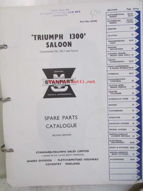 British Leyland Triumph 1300 Saloon, Spare Parts Catalogue 2. edition (part No. 515192), Katso tarkemmat mallit ja sisällysluettelo kuvista