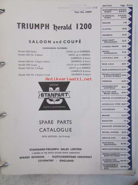 British Leyland Replacement pages for Triumph 1200 Saloon & Coupe, Spare Parts Catalogue (part No. 510597), Varaosaluettelo ja lisäsivut, Katso tarkemmat mallit ja sisällysluettelo kuvista