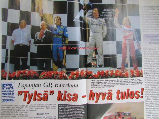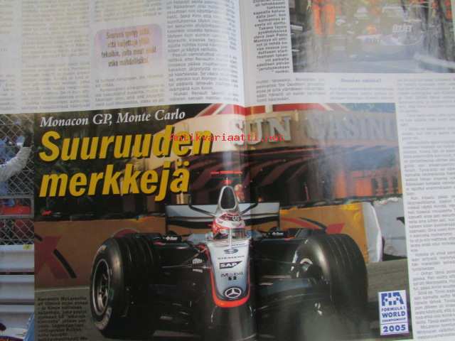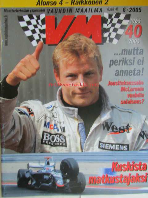 Vauhdin maailma 2005 nr 6 -mm. VW polo S2000, Kesärallien säännöt, Ralli-MM Kypros Kypros, SuperRalli säännöt, Tallinnan ralli, F-ryhmän cup Urjala, Historic rally trophy Loppi, DTM Saksa, WTCC Ranska ja Britannia, McLarenin salaisuudet, GP2 ja jarrut, F1-MM Espanja ja Monaco ja Saksa, GP2 Espanja ja Monaco ja Saksa, Rata-SM ALastaro, DragSM Alastaro, Rallicross-EM Ranska ja Portugali, KRC-SM Härmä ja KOuvola, rallisprint-SM JOensuu, New Yorkin autonäyttely, VM maistelee Mercedes Benz B 200 TURBO, RR-MM Kiina ja Ranska, Supersport- ja Superbike-MM Italia, Enduro-MM Italia, GNCC sarja USA, Elämäni kisa Matti Autio.21 x 29 cm.