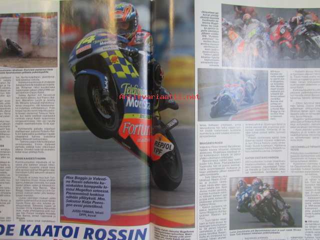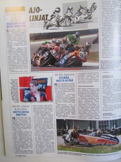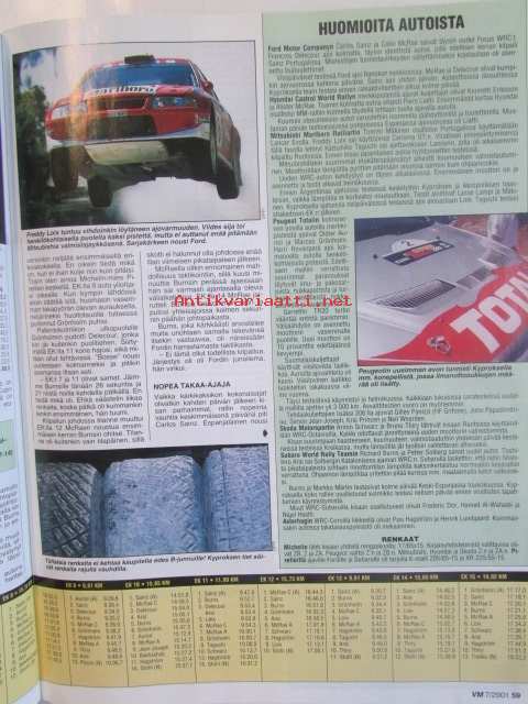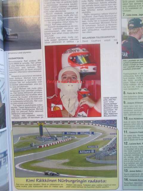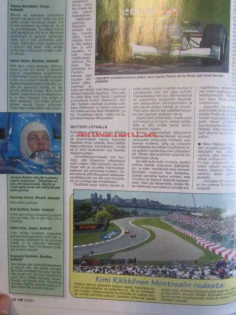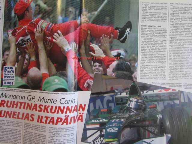 Vauhdin maailma 2001 nr 7 -mm. Driven-elokuva, JM SM yleinen joensuu, JM SM-naiset ja nuoret Pieksämäki, F1-MM Monaco ja Kanada ja Eurooppa, Indy 500, Le Mans 24h, Rata-SM Ahvenisto, Drag-SM -PM ja -EM Alastaro, Ralli-MM Kypros ja Kreikka, Ralli-SM Seinäjoki, Sprint-SM Kankanpää ja Parkano, Rallicross-SM Kaanaa, Rallicross-EM ja Nordic Cup, FK-MM Kanada, Elämäni kisa Ullamaria Helminen, Enduro-MM Suomi, RR-MM Italia ja Espanja, Motocross-MM.21 x 29 cm.
