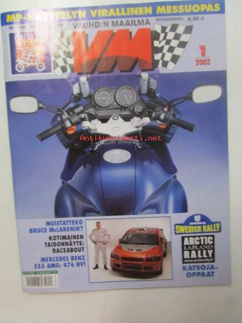 Vauhdin Maailma VM 2003 nr 1 -mm. Bruce McLaren, Span katurata, VM esittelee Mikke Hawthorn Jääspeedway, USA:n ratasarjat, Artic lapland rally, Ruotsin MM ralli, Peugeot punastui, Mikko Hirvonen, AKK palkintoristeily, FIA historic grand touring cars 2002, Biland Challenge 2002, FIA palkintogaala, Mestareiden kisa Kanaria, VW polo super 1600, Essen motor show, VM maistelee Porsche caryenne Mercedes Benz E 55 AMG Mercedes Benz 4matic, Raceabout 2000, VM käyttötesti, MP 2003 näyttelyopas, pohjakartta, näytteilleasettajat, Tuotteet ja tuotemerkit, Näyttelyantia, Suomen road race ajajat, Lapin matkailu.21 x 29 cm.