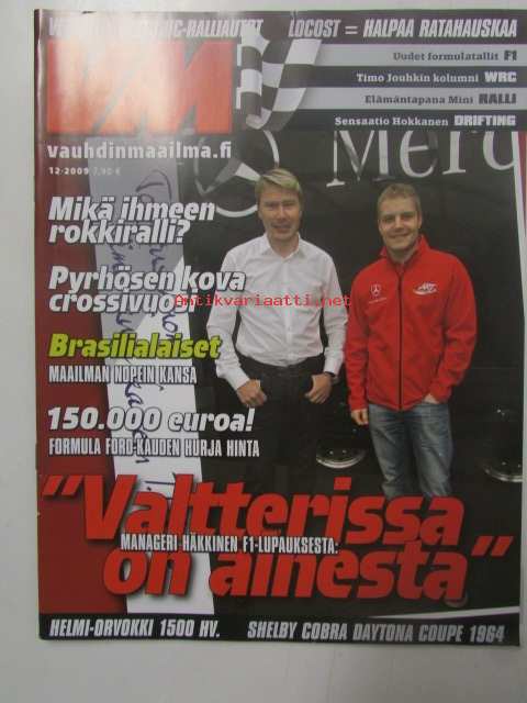 Vauhdin Maailma 2009 nr 12 -mm. Makasiini Ajo motorsport moto2 luokkaa, Minun autoni Matti Alamäellä, Koeajo Juuso Pykälistö, CO2 BRM bee four ERV, Mestarit ja oppipoika Mika Häkkinen ja Valtteri Bottas, Villeneuve yhä ykkönen michael schumacher, tallipäälikön analyysi malcolm wilson, elämäntapana mini tero grönfors, toteutunut unelma karu jälkilasku antti pyrhönen, kaikki valmista MM-finaaliin sami seliö, Lehmä nimeltä helmi-orvokki tero äyräväisen helmi-orvokki, Rapakon takana dario franchitti, grid Girl.21 x 29 cm.