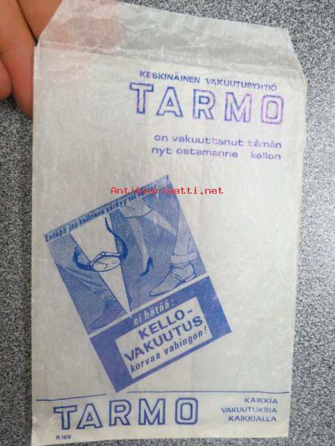 Kellosepänliikkeen pussi, jossa Vakuutusyhtiö Tarmon kellovakuutusmainos