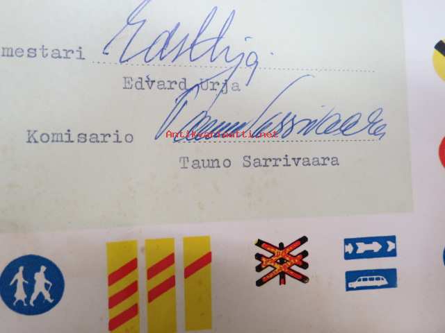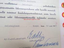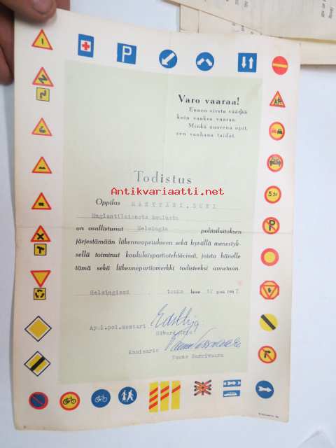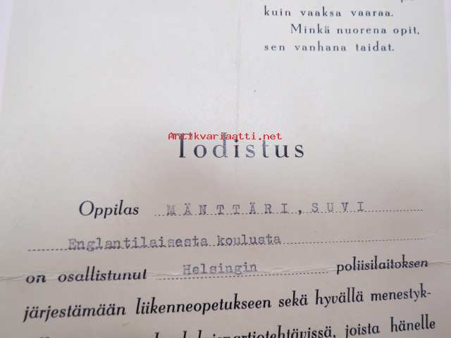 Todistus - oppilas Suvi Mänttäri Englantilaisesta koulusta on osallistunut Helsingin poliisilaitoksen liikenneopetukseen sekä hyvällä menestyksellä toiminut koululaispartiotehtävissä, joista hänelle tämä sekä liikennepartiomerkki todisteeksi annetaan. Helsingissä toukokuun 12 pnä 1967 -todistus / myöntökirja, allekirjoitukse Edvard Urja, Tauno Sarrivaara