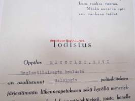 Todistus - oppilas Suvi Mänttäri Englantilaisesta koulusta on osallistunut Helsingin poliisilaitoksen liikenneopetukseen sekä hyvällä menestyksellä toiminut