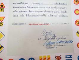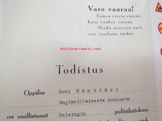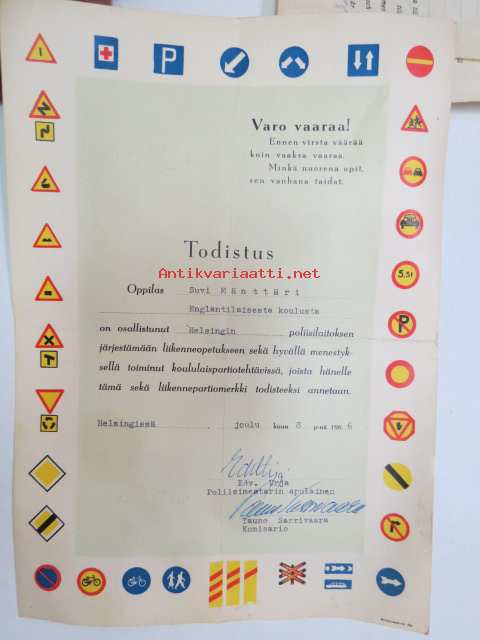Todistus - oppilas Suvi Mänttäri Englantilaisesta koulusta on osallistunut Helsingin poliisilaitoksen liikenneopetukseen sekä hyvällä menestyksellä toiminut koululaispartiotehtävissä, joista hänelle tämä sekä liikennepartiomerkki todisteeksi annetaan. Helsingissä jolukuun 8 pnä 1966 -todistus / myöntökirja, allekirjoitukse Edvard Urja, Tauno Sarrivaara