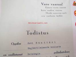 Todistus - oppilas Suvi Mänttäri Englantilaisesta koulusta on osallistunut Helsingin poliisilaitoksen liikenneopetukseen sekä hyvällä menestyksellä toiminut