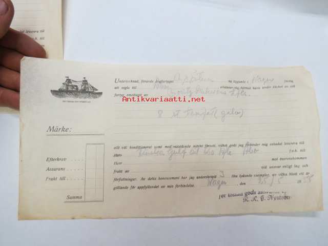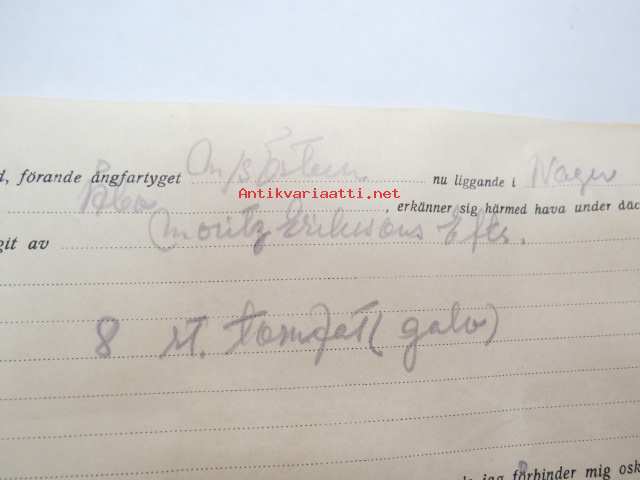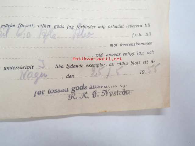 Undertecknad, förande ångfartyget M/S Östern nu liggande i Nagu.... från Moritz Erikssons Eftr. mottagit.... 25.5.1955 -konossementti / laivarahtikirja