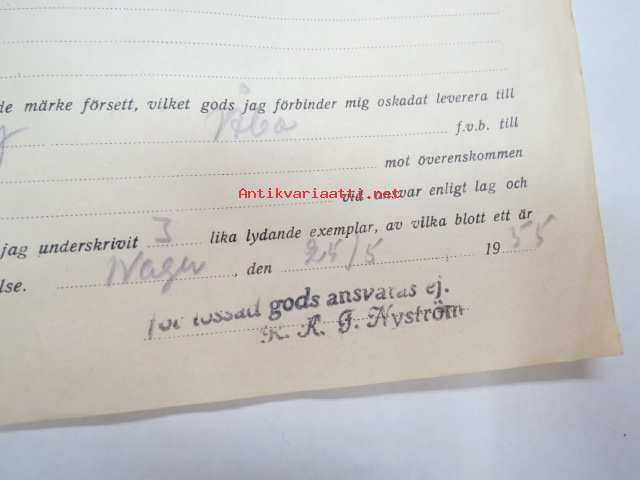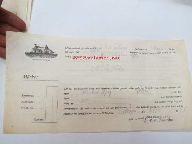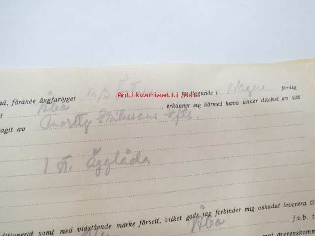 Undertecknad, förande ångfartyget M/S Östern nu liggande i Nagu.... från Moritz Erikssons Eftr. mottagit.... 25.5.1955 -konossementti / laivarahtikirja