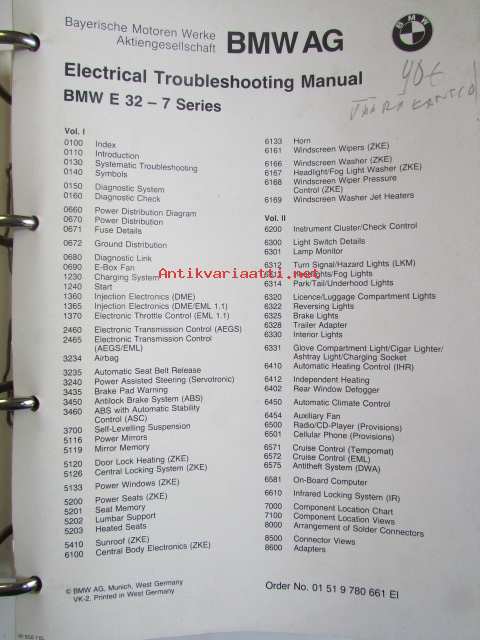 BMW Electrical Troubleshooting Manual supplement 1, E 32 7-series 1987, Elektroniikan ongelmien ratkaisut, Katso kuvasta tarkemmat malli ja sisällystiedot.
