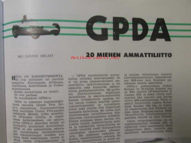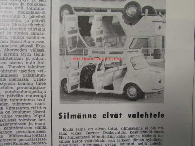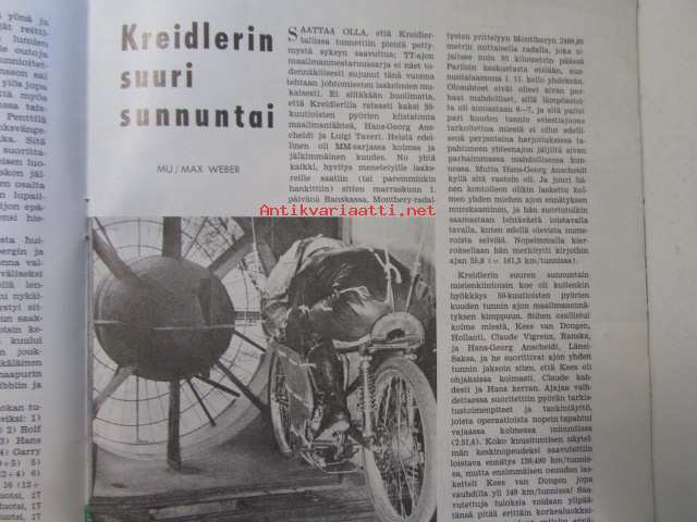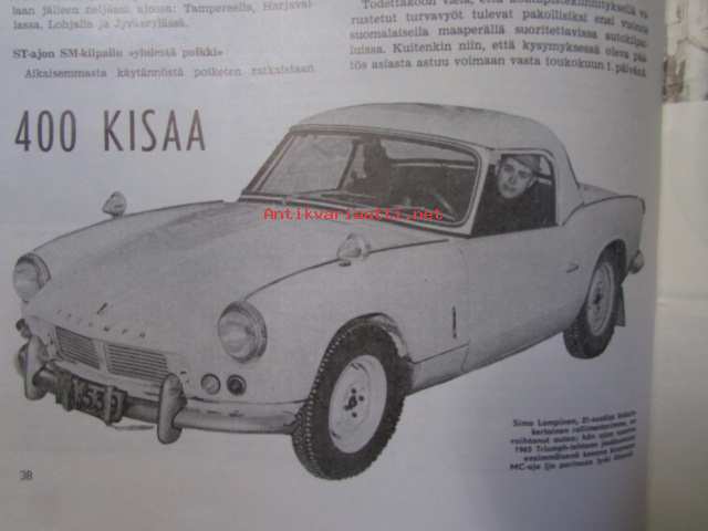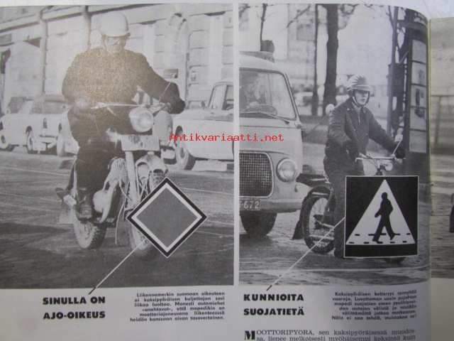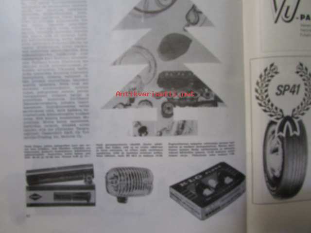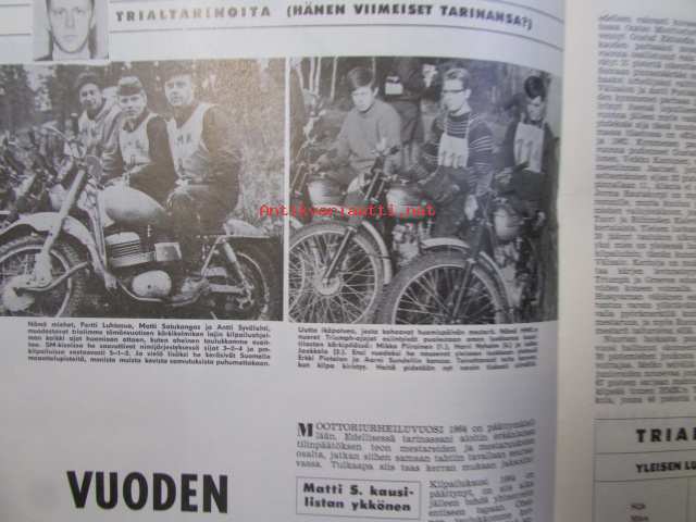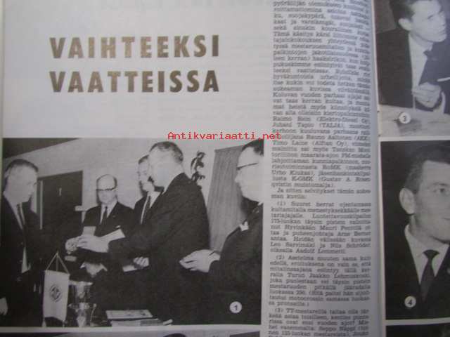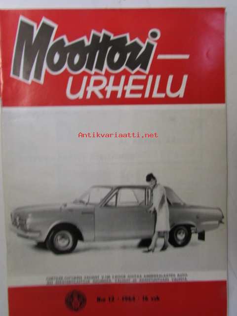 Moottoriurheilu 1964 nr 12 Moottoriurheilu 1964 nr 12 -mm. He päättävät SML:n asioista vuonna -65, Hallitus esitti ja voitti: vaihdoksia puhemiehistössä, FIM valloittaa maailmaa, Vaihteeksi vaatteissa, Päivä presidentti Suzukin seurassa, Kreidlerin suuri sunnuntai, Moottoripyörä ja mopedi liikenteessä ja sinulla on ajo-oikeus ja kunnioita suojatietä ja varo vaaraa ja paikoita oikein, Tähtiä ja vauhtia rautoja, Antin trialtarinoita: Hänen viimeiset tarinansa, Vuoden parhaita meillä ja muilla, Kovia kuskeja made in Finland, Vuoden ST-radar ja -ratamestarit, 21 x 29 cm.