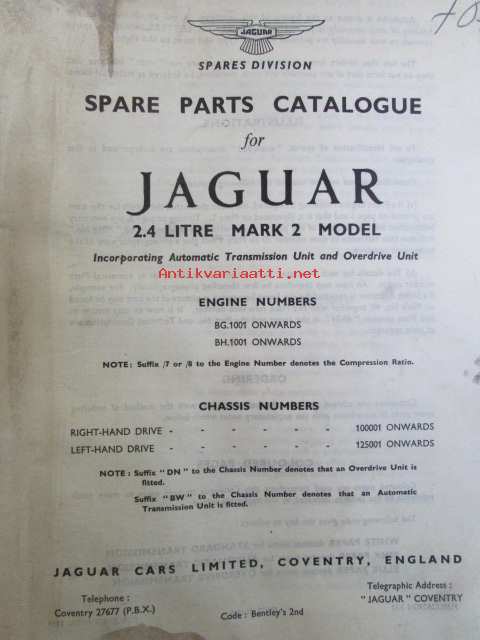 Jaguar 2.4 litre Mark 2 Model SPare Parts Catalogue Engine numbers BG.1001 Onwards / BH.1001 Onwards - Varaosaluettelo, Katso tarkemmat mallit ja sisällysluettelo kuvista