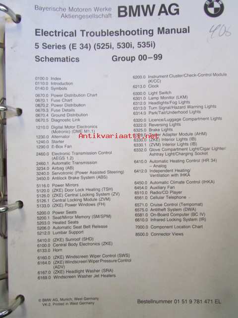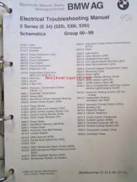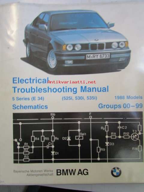 BMW Electrical Troubleshooting Manual, 5 Series ( E 34), 525i, 530i, 535i, Schematics Models 1988 Groups 00-99, elektroniikan vaianmääritys ohjekirja, Katso kuvasta tarkemmat malli ja sisällystiedot.
