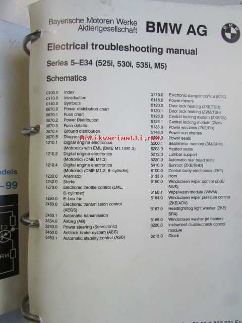BMW Electrical Troubleshooting Manual, 5 Series - E34, 525i, 530i, 535i M5, as of 1989 Models, elektroniikan vaianmääritys ohjekirja, Katso kuvasta tarkemmat malli ja sisällystiedot