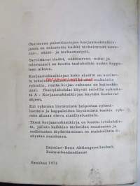 | Saatavilla | 1 kpl | | Julkaisuvuosi | 1973 | | Kunto | K2 | | Sidonta/painoasu | Kansio | | Kielet | Suomi |