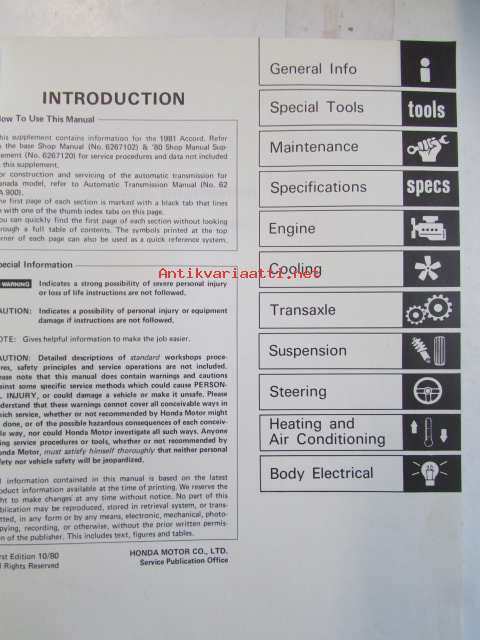 Honda Accord Shop Manual 1977 / Honda Accord 3DR H/ Back, Accord 4DR SED Supplement 1980, Sisältää 2 eri korjauskirjaa, katson kuvista tarkemmin muut tiedot ja sisällysluettelo
