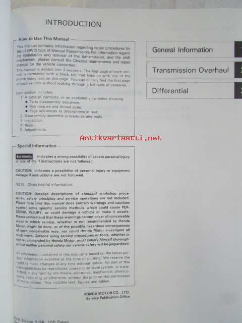 Honda Shop Manual L3 (4WD ) Manual Transmission Maintenance and Repair 1988 - Vaihdelaatikon Korjauskäsikirja, katso kuvista tarkemmin muut tiedot ja sisällysluettelo