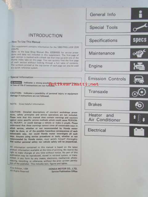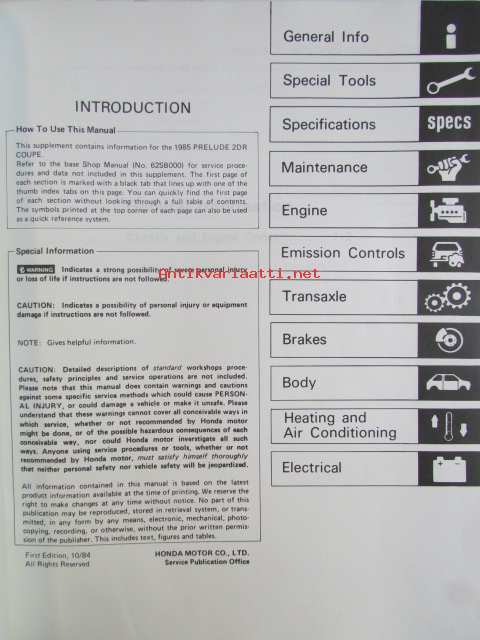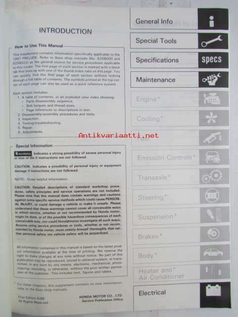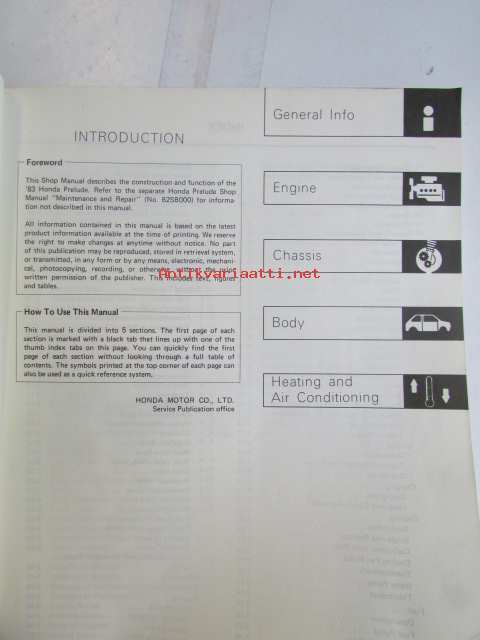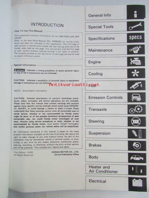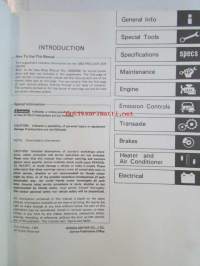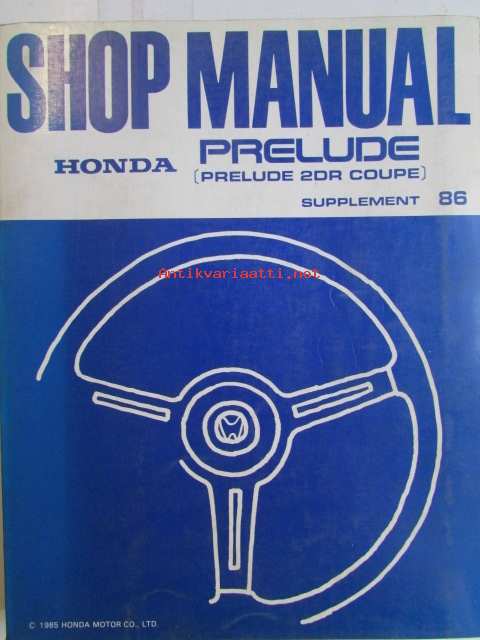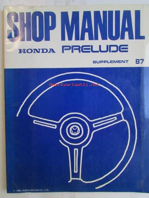 Honda Prelude Shop Manual 2DR Coupe Construction and Function 1983, Prelude 2DR Coupe Supplement 1984, Prelude 2DR Coupe Supplement 1984, Prelude 2DR Coupe Supplement 1986, Prelude Supplement 1987 - Sisältää Honda Preluden 5 eri korjauskirjaa, katson kuvista tarkemmin muut tiedot ja sisällysluettelo