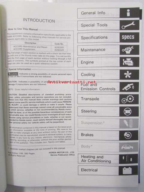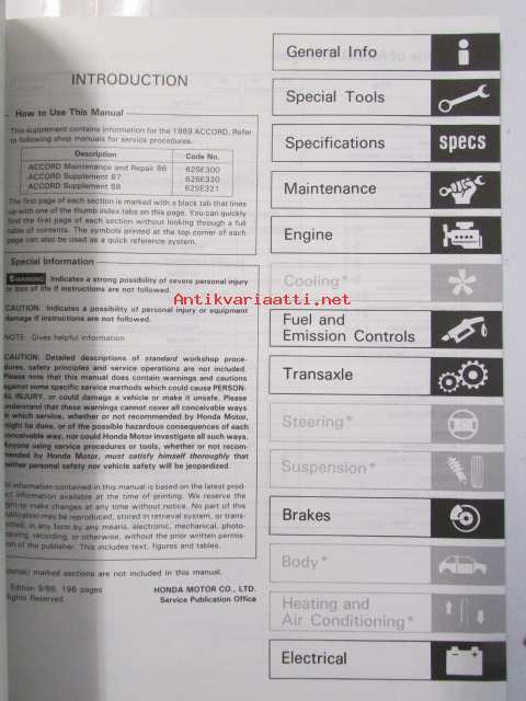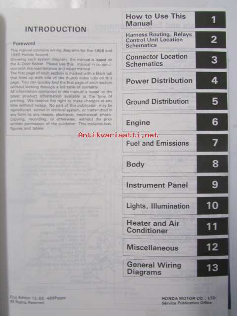 Honda Accord Shop Manual Electrical Wiring Diagram 1988-89, Accord Supplement 1988 an 1989 - Sisältää Honda Accordin 3 eri korjauskirjaa, katso kuvista tarkemmin muut tiedot ja sisällysluettelo