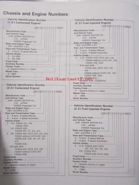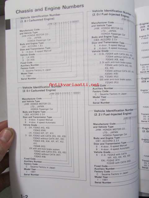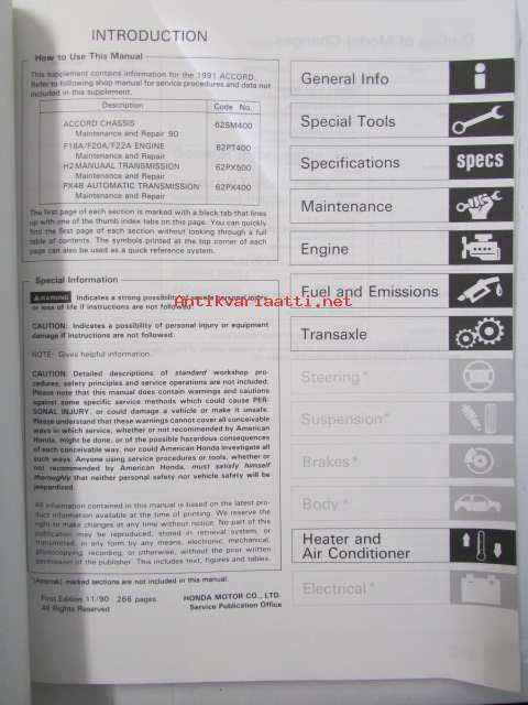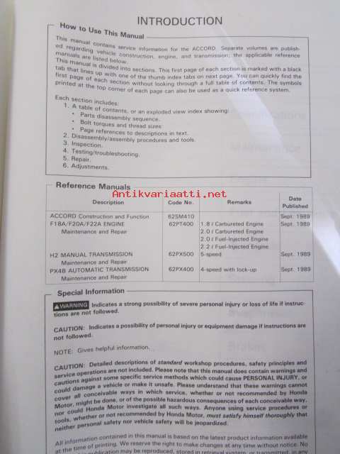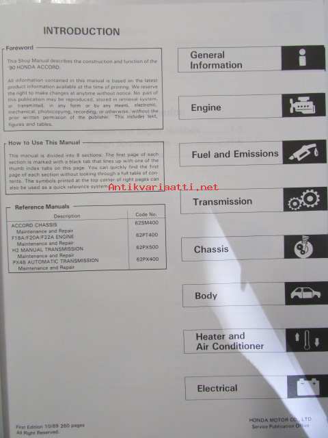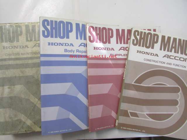 Honda Accord Shop Manual Construction and Function 1990, Body Repair Manual 1990, Chassis Maintenance and Repair 1990, Accord Supplement 1991 - Sisältää Honda Accordin 4 eri korjauskirjaa, katso kuvista tarkemmin muut tiedot ja sisällysluettelo
