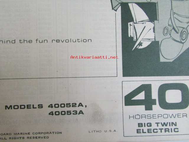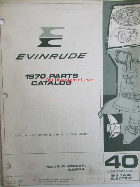 Evinrude 1970 Parts book 40 Horsepower Big Twin Electric (First in outboards), katso tarkemmat mallimerkinnät kuvista.