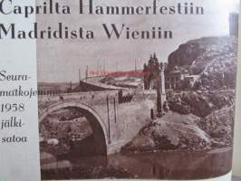 Kotiliesi 1958 nr 22 -mm. Talvikauden ruokalista, Ranskalaisen emännän keittiövälineitä, Tyttäret lähtee koulujuhlaan, Lapsen ensimmäinen vuosi, Seuramatkojen 1958 jälkisatoa Caprilta-Hammerfestiin Madridista Wieniin, Kuka perheessä eniten kuluttaa, Hirsitalo kannattaa uusia, Piano avaa musiikin maailman, Tarkastele kuvista tarkemmin sisältöä.21 x 29 cm.