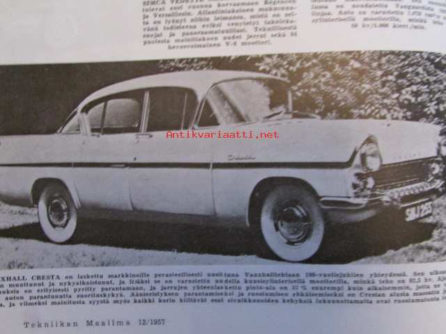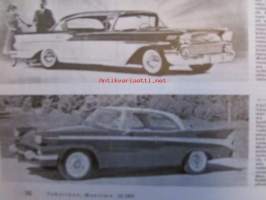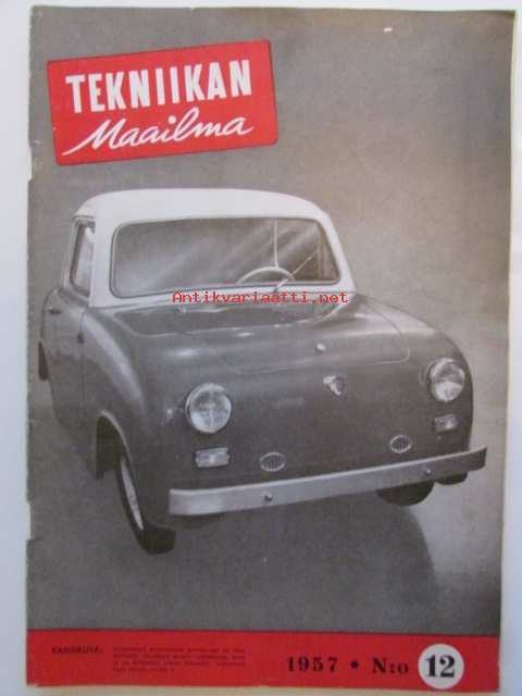 Tekniikan Maailma 1957 nr 12 -mm. Kannessa Suomalainen pienoisauton prototyyppi, Kuukauden kytkentäkaavio monipuolinen 2,5W pienoisvahvistin, Käsitelkää LP-levyjänne oikein, Uusia autoja ( Packard Hawk, Ford Fairlaane, Buick Century, Stubaker Scotsman, Chrysler Imperial, Mercury Park Lane, Lincoln Capri, Chervolet Bel Air, Vauxhall Cresta Volga, Skoda 450, D.K.W. 600, Smyk, Alfa Romeo 2000, Standart Pennant, Auto Union 1000 Coupe ), Simca Aronde 1300 koeajossa, Suomessakin seurataan Sputnik, Saksan lentokone teollisuus Dornier Do 27, Noratlas, Fouga Magister,David G. Simons Ennätyskorkeuteen muovi-ilmapallolla, Tarkastele kuvista tarkemmin sisältöä21 x 29 cm.