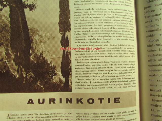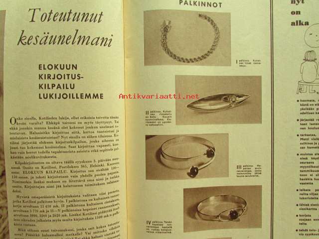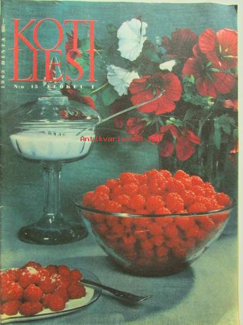 Kotiliesi 1962 nr 15 -mm. Ompelemme ja kirjoimme, Mansikkamaa sadon jälkeen, Raili Manninen Sadon korjuun aikaan, Kesämökin valaisimet paranevat, Suomalainen koti välimeren rannalaa Professori Ilmari Hela, Miten kohtaat Hänet?, Tohtori Ella Kitunen Kotitalousopetus kehitysvaiheessa, Tarkastele kuvista tarkemmin sisältöä.21 x 29 cm.
