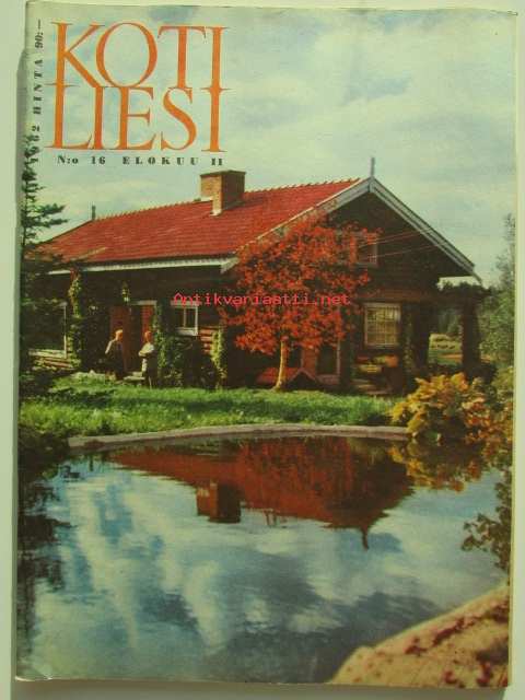 Kotiliesi 1962 nr 16 -mm. Päivänvaloa keittiöni työpäydälle, Pyörillä liikkuva kaappi-pöytä, Nyt ovat vuorossa sienet kurkut ja puolukat säilöntään, Syksyllä luomme kevät puutarhan, Koulussa toisella paikkakunnalla, Anttilan maatalouskerho, Esikoulun ikäinen lapsi, Maisteri Anneli Kuusi Tyyni Tulio tulkitsee suurten ajatusten naisia, Tarkastele kuvista tarkemmin sisältöä.