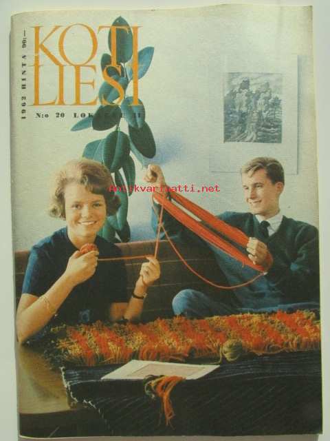 Kotiliesi 1962 nr 20 -mm. Astiankuivauskaappi pesupöydän yläpuolelle, Vähentäkää kotitaloudessanne kuljetustöitä, Kukkia ja Kasveja pimeän vuodenajan iloksi, Nuorenparin virkaasunto, Hoivaava Nainen, Sähköistettyä taloutta, Messumatka maailmanympäri, opettajat Sirkku ja Heikki Aurell Perhonsiiven koulu Kiuruvesi, Wärtsilän värillinen emalimainos,