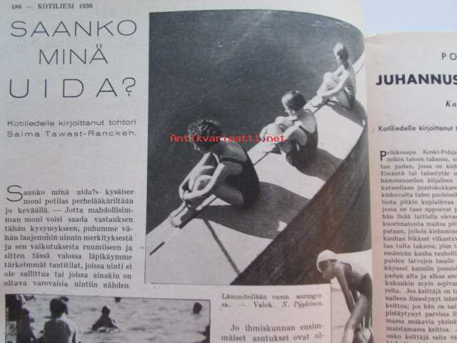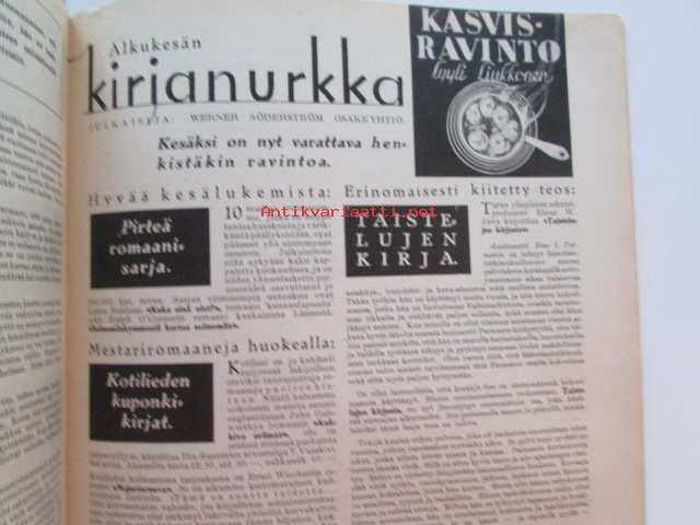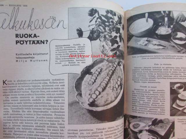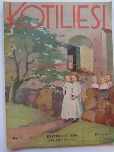 Kotiliesi 1936 nr 12 Kesäkuu (Kansi Martta Wendelin , aihe rippilapset) -mm. Pohjanmaalla keitetään juhannusjuustoa eli punaista heraa, Taipalsaari kirkko juhlaa yli elämän, Japanilainen valkoinen lilja, Elin Sjöström Alkukesän ruokapöytään, Kala ja tillipaistos, Pinaatti ja muna, Tarkastele kuvista tarkemmin sisältöä.21 x 29 cm.