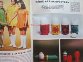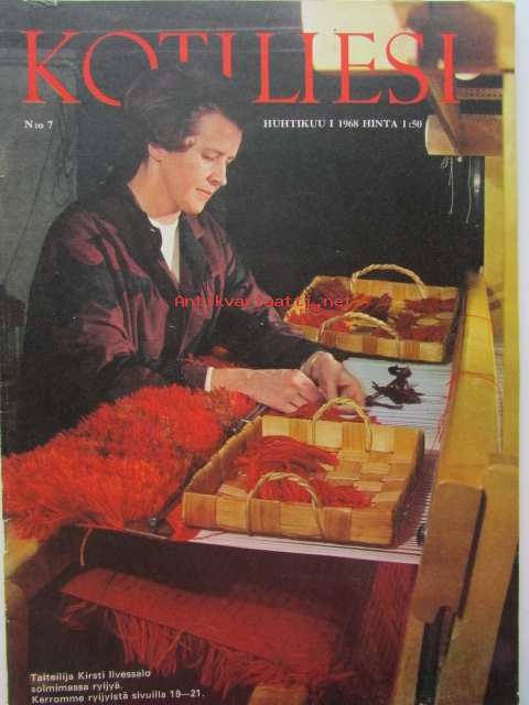 Kotiliesi 1968 nr 7 - Huhtikuu mm. Lakko sairaaanhoitajien aseena, Uhattu uskonnonopetus, Anja Tiilikainen tutkija avainasemassa, Pettymyksien kiveämä on Tansanian kehityksen tie, Väriä pääsiäispöytään, Uima-allas ylellisyys vai todellinen tarve, nykyajan ryijy -artikkeli kuvineen. Katso kuvista tarkemmin sisällys.