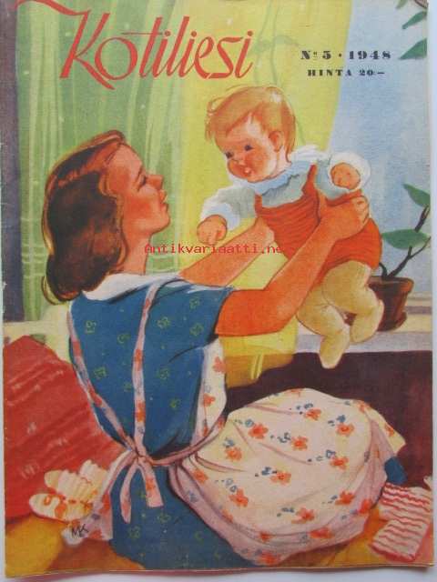 Kotiliesi 1948 nr 5 -mm. Pienoiskeittiö emännän laboratorio, Terveystalo äitien ilo kunnan ylpeys, Virkattu päähine on muodikus, Oi pihvi ystävä vai vihannes, kokeilkaa tätä Maksapihvit ja Kääretorttu vaniljakastikkeessa ja Keksit, Katso kuvista tarkemmin sisällys.21 x 29 cm.
