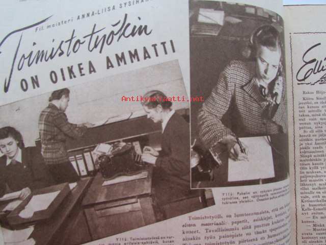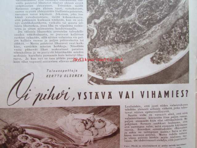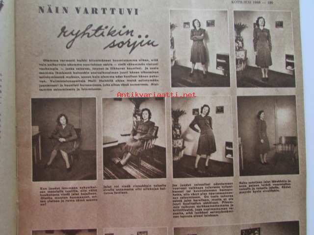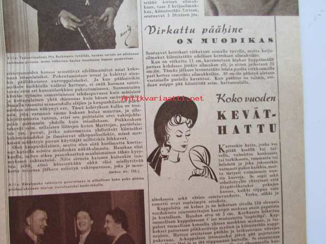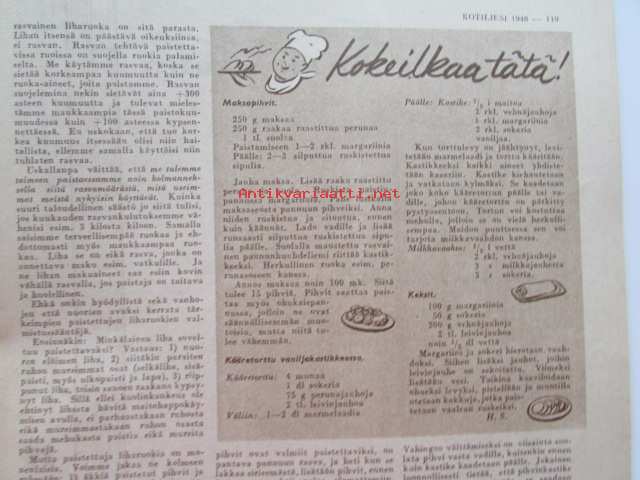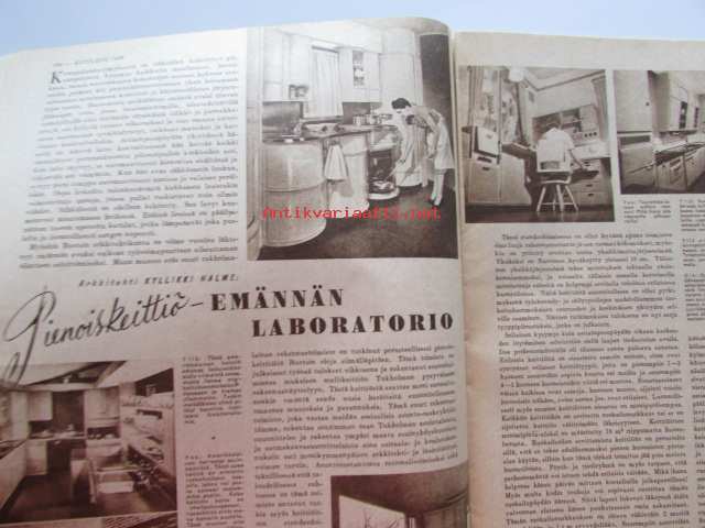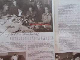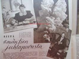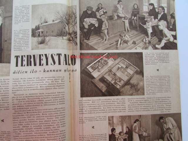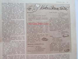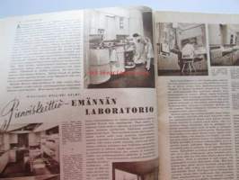Kotiliesi 1948 nr 5 -mm. Pienoiskeittiö emännän laboratorio, Terveystalo äitien ilo kunnan ylpeys, Virkattu päähine on muodikus, Oi pihvi ystävä vai