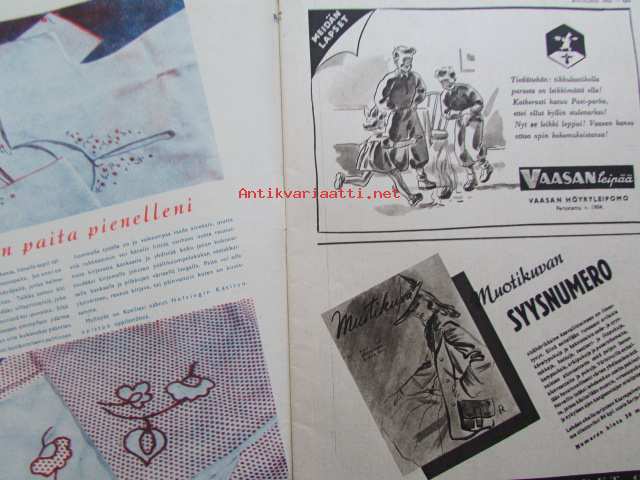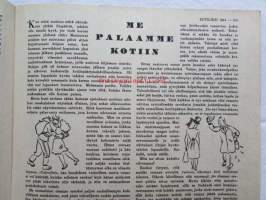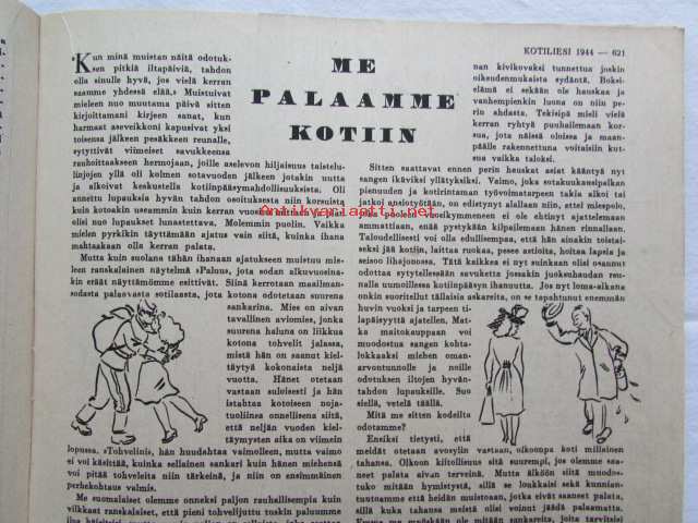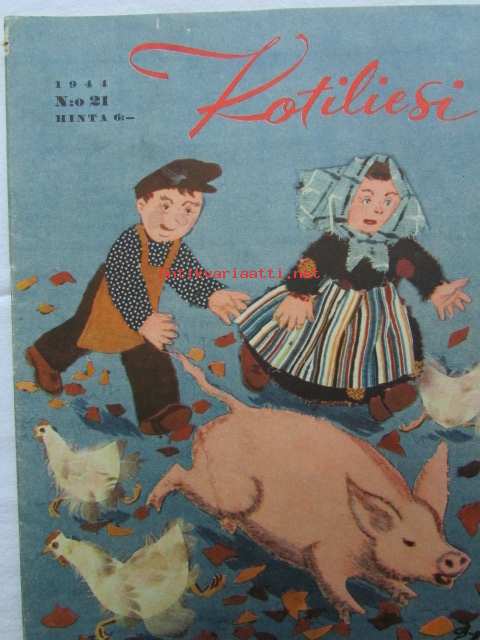 Kotiliesi 1944 nr 21 -mm. Aiheita mm. Pakina silakkalaatikosta, Maisteri Ella Kitunen, Saippuan valmistus kotioloissa, Eläviä muistomerkkejä, Nainen työmarkkinoilla sodan jälkeen, Katso kuvista tarkemmin sisällys ja mainoksia. Takakannessa lasten piirros / askartelutyö: Terttu Mäkinen Kiviniemen kesä sekä Liisa Ingman Kesän kukkia. 21 x 29 cm.