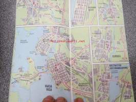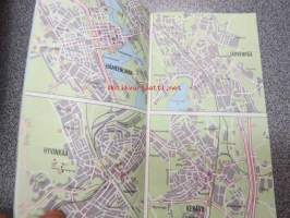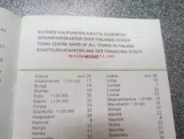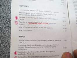 Kaupunkien kautta-ajokartat, tiekohtaiset nopeusrajoitukset, ensiapusairaalat ja terveyskeskukset / Genomfratskartor över städer, hastighetsbegränskningar,