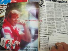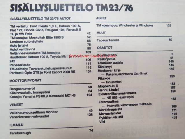 Tekniikan Maailma 1976 nr 23 Suuri autonumero, sis. mm. seur. artikkelit / kuvat / mainokset; Vertailussa Fiesta - Honda - Fiat - Renault - VW - Peugeot - Datsun, Autotaulukossa kaikki henkilöautot, 25 vuotta koeajoja - kaikki nämä olemme testanneet teille, Paritesti Escort RS - Kadett GTE, Koeajo Moskvits Elite 1500, Lontoon autonäyttely, Koeajo Yamaha FS 80 - Kawasaki MC1-B, Monitor -vene, Farnborough ilmailunäyttely, Episkooppi, Wincehster & Winchoke, Nuorgamin Moottorikelkkojen Tenoralli - Tahpatus Teaänu siste -saamenkielinen reportaashi ko. kisasta!, Erilainen - käsinmaalattu konepyörä ym.22 x 30 cm.